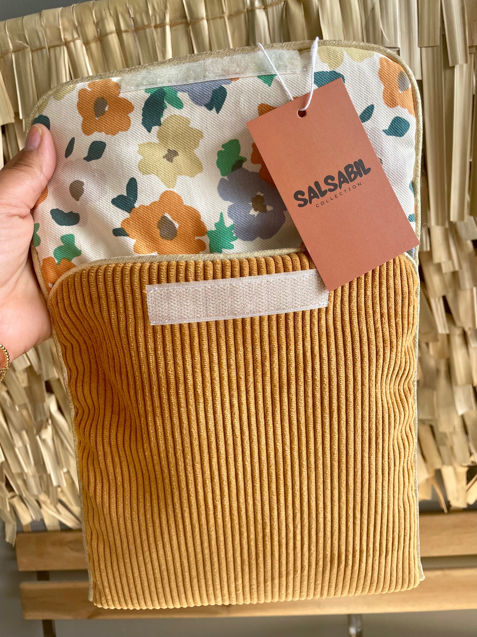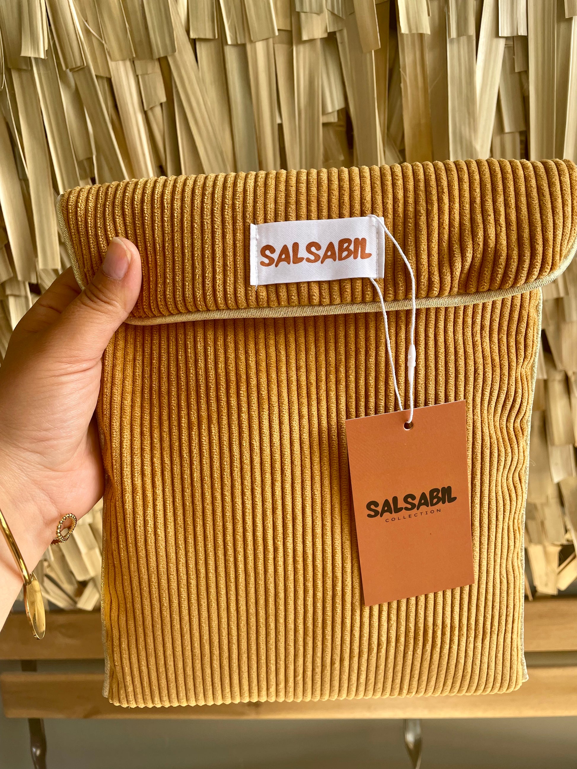 Réalisée en velours côtelé couleur moutarde, elle se distingue par sa texture chaleureuse et son allure intemporelle.